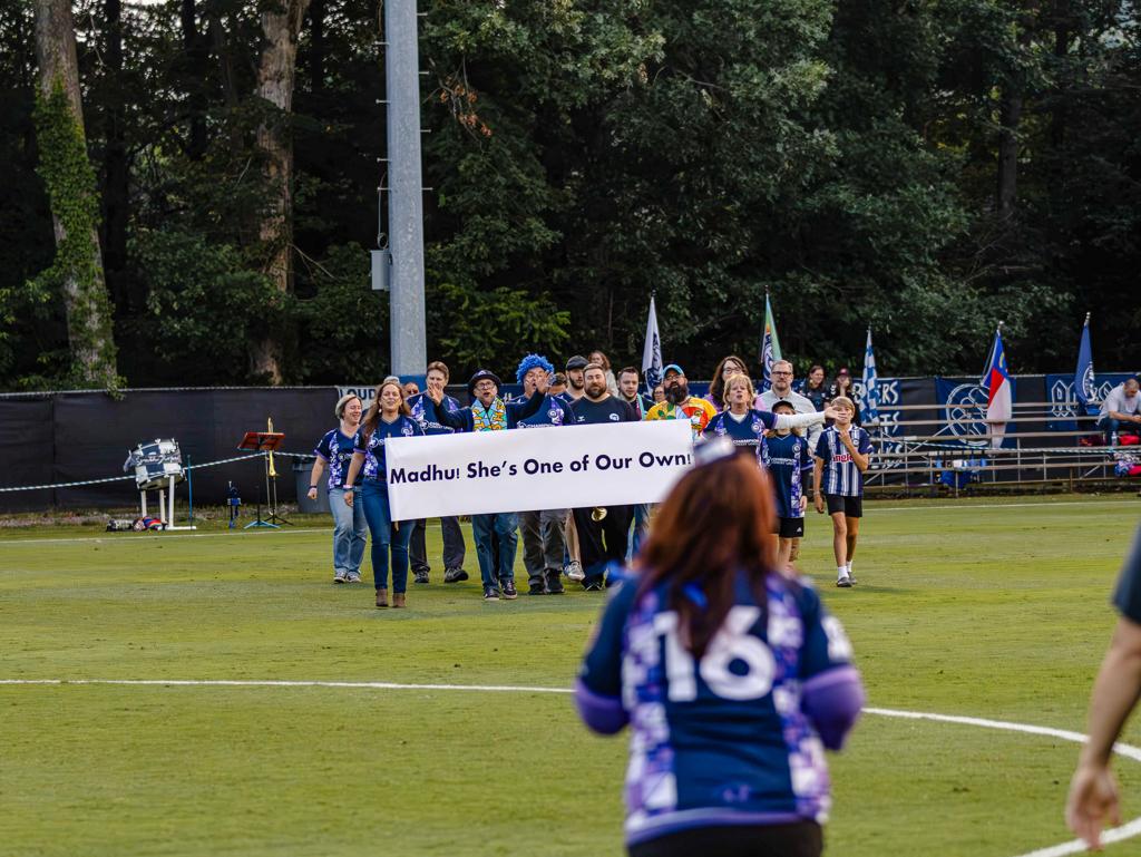 During halftime, Madhu Schmid was recognized as the 2025 Meghann Burke WNC Soccer Pollinator Award winner for her contributions to the soccer community. Stacey Enos lead the crowd in a cheer and Madhu's fellow fans met her at midfield for the celebration.
